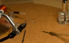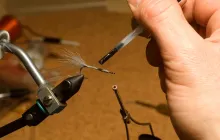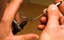 A key to the skinny appearance of this fly is to use half a hackle... and that's not half length, but split down the middle! In reality we don't split it, but just remove the barbs on one side. This makes it much easier to tie in the hackle on the hard and smooth body and also makes the fly a lot less bushy.
